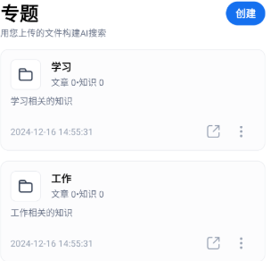 玩家可以上传自己的文件构建AI搜索,由两部分组成,分别是文章与知识库。