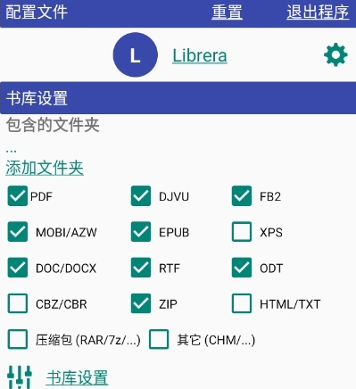 然后在书库设置中,添加文件夹,以及设置文件扫描格式。