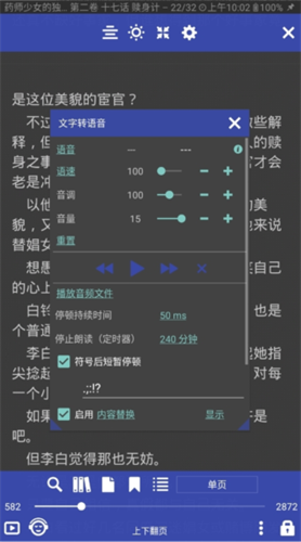 点击左下角可以进行文字转语音,从而开启听书模式,但是前提是你手机里安装且支持TTS语音引擎。