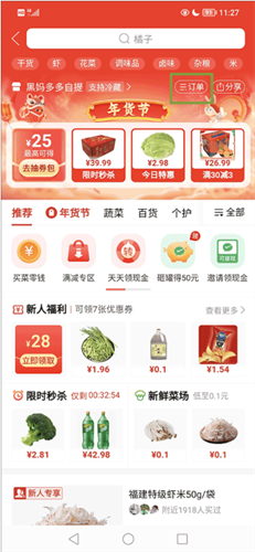 1、首先,打开软件,在多多买菜当中找到并点击绿色方框内的“订单”选项;