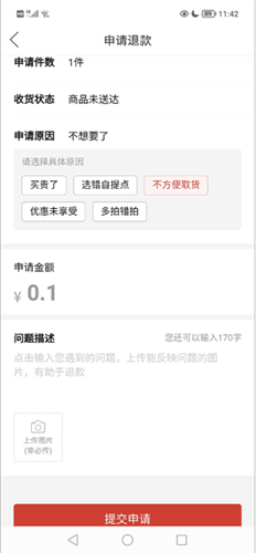 4、接着在申请退款中选择好退款原因,填写好问题描述后找到并点击“提交申请”选项;