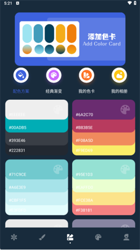 4、添加色卡板块,有配色方案、经典渐变、我的色卡等功能板块。