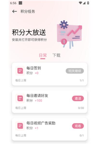 3、在积分任务界面可以看到三个任务可以每天做的,【每日签到】、【每日邀请好友】和【每日视频广告奖励】都是可以获得积分的,其中每日邀请好友可以做30次的,其他都是1次的。