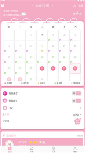 女生例假记录2026最新版是经期例假记录软件,提供了全方位的功能,经期记录用着挺贴心的,每次来月经记一下就行,功能十分的全面,App内还可以添加心情、症状、流血量等各种经期状况记录,让你可以足够快乐的度过例假,软件可以通过这些记录进行数据分析,给用户提供调理方式,让用户可以更舒服的度过经期。软件会自动推算下次经期时间,提前提醒做好准备,还能记录那几天的身体状况,比如肚子疼、情绪波动这些。排卵期和安全期也算得挺准,重要日子提前知道。数据统计很直观,身体变化趋势一看就明白。界面设计得简洁私密,用起来没有负担。对需要关注生理周期的女生来说,这个健康小助手确实实用。养成记录习惯后,对自己身体更了解了。