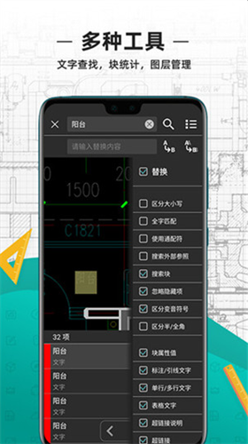 3、绘图工具,真正的CAD图纸绘制、测量、标注、搜索、捕捉等编辑功能。
