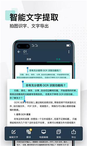 4、手机扫描仪、告别扫描仪繁琐的操作,随时随地,一个手机就搞定一切,OCR识别,图片转文本图片的长篇文字瞬间变文本,识别中英日韩等16种语言,自动切边,图像美化,手机拍文档,自动去除杂乱背景、生成高清JPEG图片或PDF文件