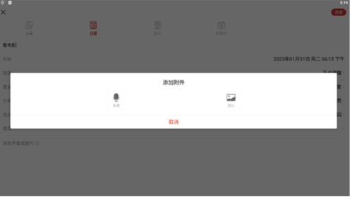 另外日程中还可通过点击【添加声音或图片】来添加录音和图片