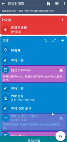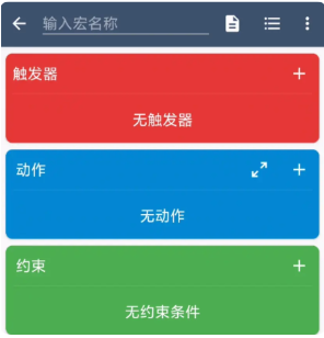 建立一个基础的功能,需要填写3个步骤,MacroDroid的触发器、动作和例外条件。