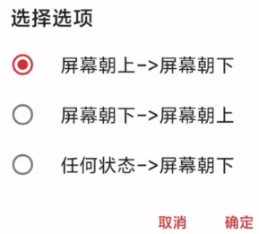 软件的触发器支持非常多的条件,这里来演示一下翻转屏幕自动静音(你也可以设定其他想要的操作)。选择好设备翻转触发之后,可以看到它会问你:是从什么状态变化的时候才触发。