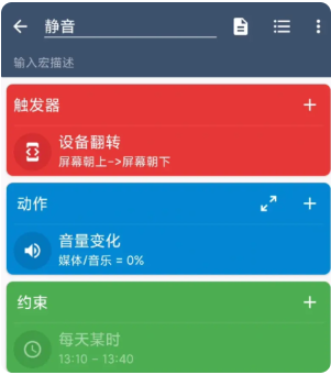 设定好限制时间,就能在指定时间,翻转一下手机自动静音了。在早上去公司的路上,也可以设定成在指定时间,连接上耳机的时候,自动打开某个软件并播放音乐。又或者是摇一摇切歌等,只要加好限制条件就能较少很多误操作。