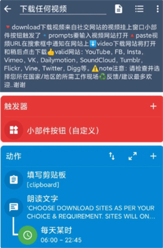 有了ta能实现不少骚操作,像是在指定时间打卡什么的,在脚本模板里面可以看到这个软件有许多玩法,从充满电自己震动提醒到改造成一个自动下载器...上限很高。