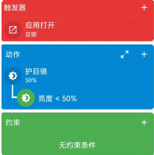 每个动作也可以单独加上限制条件,自动化软件最怕的就是在不想运行的时候自己操作,在这方面做得还是挺好的,响应速度也很快,像是到了夜晚打开软件自动开启护眼,这个就挺适合老司机熬夜啥的。