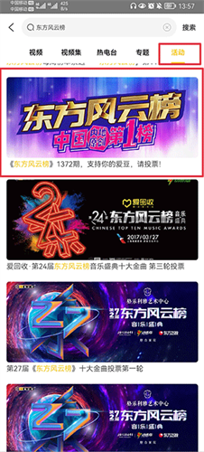2、然后在栏目列表中可左右滑动然后选择活动页面,并在活动页面中点击正在进行的投票活动