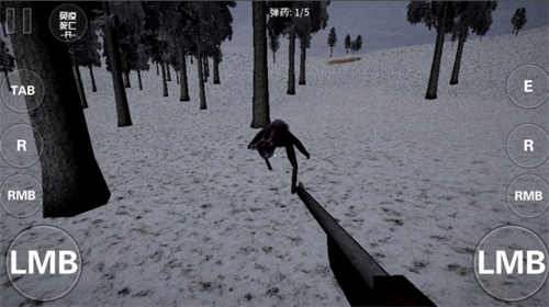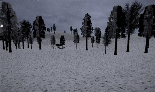 1、在开放式的雪林场景中探索追踪,使用望远镜观察环境,发现非鹿活动的痕迹与巢穴区域。