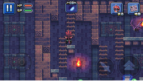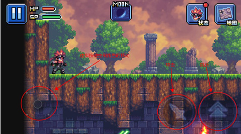 一、在进入游戏后点击新游戏正式进入闯关页面后你会看到地图的左侧有一个控制盘,按住控制盘的中心上下左右拖动控制盘就可以操控你的英雄去你想去的方向。在正式进入闯关页面的右侧会有一个红色和一个蓝色的按键,红色按键是控制攻击的按键,蓝色按键是跳跃按键。