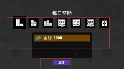 2、每日奖励界面可领取金钱、道具等资源,点击【继续】即可获取奖励,积累资源的稳定途径,助力角色成长。