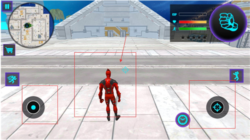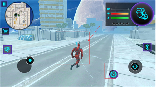 3、在场景中左侧虚拟摇杆控制移动,右侧按键对应技能或加速操作,左上角地图可查看位置与目标区域。
