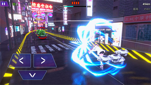 2、赛博朋克场景精心设计,霓虹灯管与全息投影交织出未来感十足的城市街景,动态光影效果与武器轨迹随战斗实时变化营造绝佳氛围。