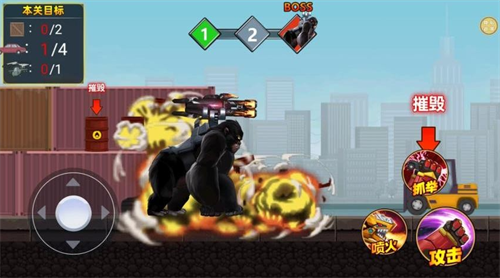3、战斗过程中顶部显示关卡进度,右下角动作区包含抓取射击等战术指令按键供玩家调用。