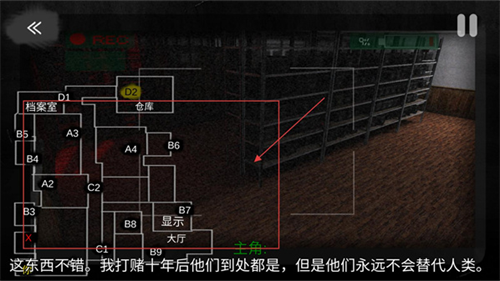 1、界面展示了包含档案室、仓库等区域的地图,可结合地图规划移动路线,同时当前场景的对话内容是剧情线索可推进探索。
