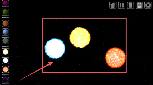 2、进入游戏后,看到左边那个带彩色条纹的圆形图案了吗,它被红框标出来了,点击这个圆形就能在太空中创建一个新的星球了。