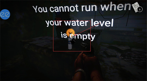3、当提示水等级为空时无法奔跑,需拾取水瓶类道具补充水分,需留意场景中的补给物品以保障生存状态。