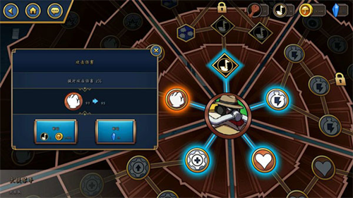 在这里你可以升级角色或者提升天赋。在升级天赋的时候建议大家优先选择提升伤害或者增强暴击的天赋。在角色的下方是技能点击可以查看技能伤害等级或者升级出售。