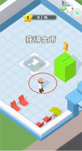 1、进入游戏后首先收集金币资源,移动至指定区域自动消耗金币完成前台接待处的建造。