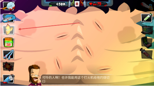 1、看到角色有切口,根据提示,选择打火机工具,用它来灼烧切口,这一步可对切口进行初步处理,为后续治疗做准备。