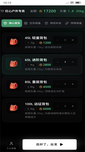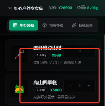 进入商店配置物资,然后在“游戏“页依次执行行动卡、管理状态与体能,目标是在资源耗尽前安全抵达终点或撤退。