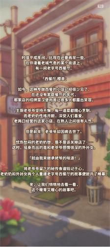 1、游戏以一家小餐厅为背景,通过经营故事,玩家帮助奶奶和外孙女一起经营餐厅。