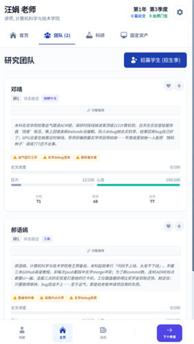 从“青椒”入职到院士竞选的完整职业链,涵盖项目申请、论文发表、学生指导、职称评审等核心环节,甚至包括学术会议社交、经费争夺等隐藏玩法。