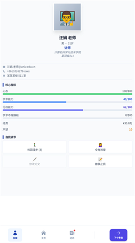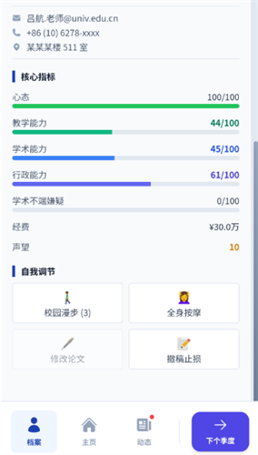 随机事件系统:突发学术争议、学生退学、家庭矛盾、职场派系斗争等,让玩家体验“学术人生如戏”的荒诞感。