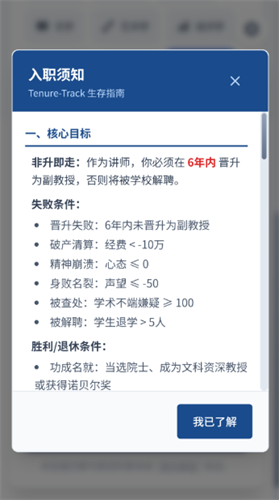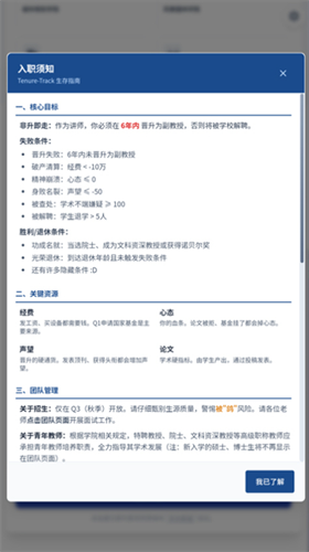 1、游戏时间以学年为单位推进,有人 6 年考核期没过需要离开,有人成功晋升为副教授、特聘教授,院士,还有人获得了至高荣誉诺贝尔奖。