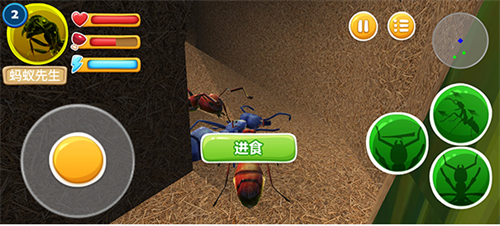 2、玩家运用上帝的视野控制蚂蚁外出寻食、搜集食物资源,维护蚁后,培育蚁蛹,与其他玩家抢夺资源,不断发展壮大自己;