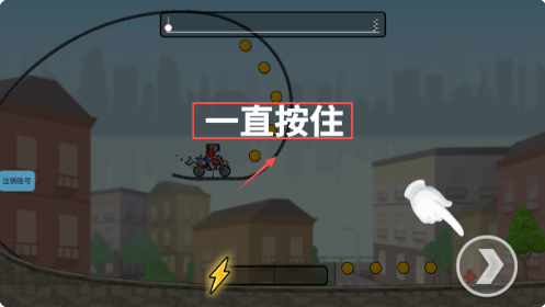 1 、进入游戏后你会看到角色骑着摩托车在赛道上,画面上方有进度条和金币,记得要一直按住屏幕来保持动力前进。