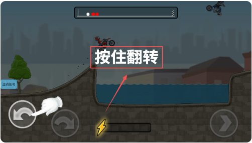 2 、遇到图中这样的坡道时,注意屏幕下方会出现“按住翻转”的提示,按提示操作翻转车身就好,不过要把握好时机,不然可能会掉进水里。