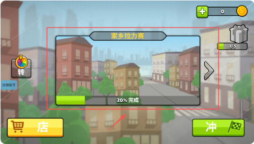 4 、在家乡拉力赛板块中,进度显示为20%完成,旁边有礼物盒图标写着1/5.界面左上角有带“转”字的彩色按钮。