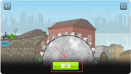 3 、在游戏界面里,你会看到城市建筑背景和显眼的锯齿状转轮,转轮前方有红色箭头指示方向,下方还有绿色的“复活”按钮。