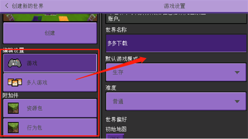 4、创建新的世界,支持玩家对游戏的难度、模式、世界偏好、邀请成员的权限,世界类型等等超多内容进行自定义的设置,除此之外也可添加本地的资源包以及行为包。
