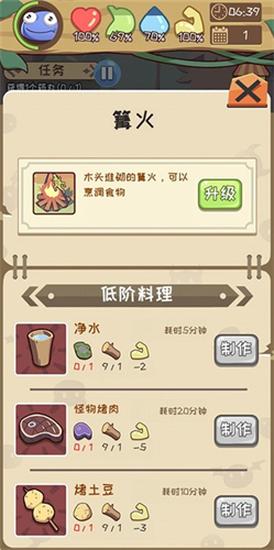 在获取到足够资源就可以开始物品的制作啦,首先需要先制作一个篝火,然后就可以查看可制作的物品。