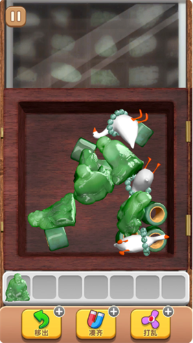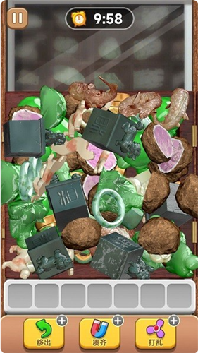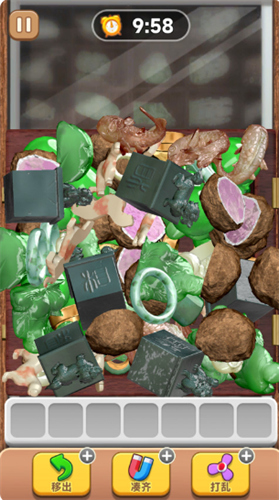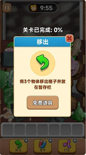 4、玩家可使用道具进行帮助,如“移出”道具,可将3个物体移出格子并放在暂存栏;