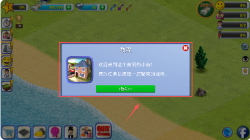 2、接着系统会弹出教程窗口,引导你先建造房屋来吸引居民,记得留意界面下方的道路和各类功能按钮哦。