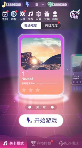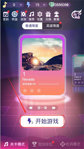 1、在游戏的主界面点击下方的开始游戏按钮,花费3点体力值进入对应的歌曲闯关。