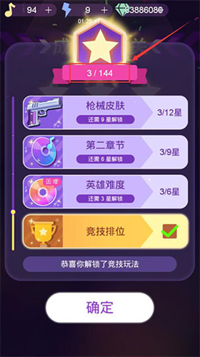 7、我们此时已经获得了3颗星星,解锁了竞技排位功能,随着星星的收集数量越来越多,我们还将解锁更多的枪械皮肤、游戏的第二章节以及英雄难度。