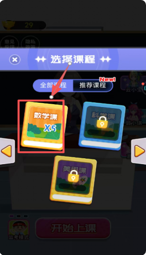 1、进入课程选择界面,可看到 “全部课程” 标签下有 “数学课” 选项,标识 “×5”,同时存在锁定状态的课程。