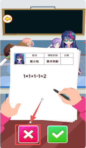 3、课后出现算术判断作业,题目为 “1×1+1-1=2”,界面提供按钮用于判断对错。