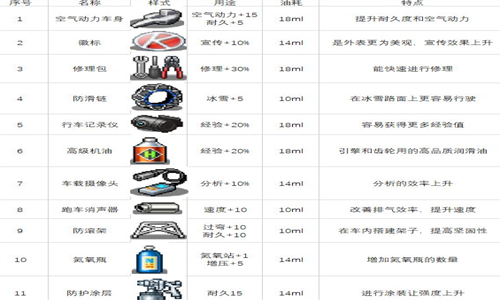 车载摄像头:分析的效率上升。乍一看没什么用,但考虑到游戏中需要用到研究数据的地方非常多,而安装车载摄像头后,在比赛中技术点的增加速度会比平常状态更快。