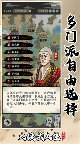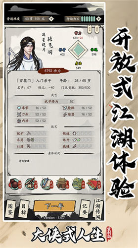 大侠式人生内置菜单最新版本是由三颗柚工作室制造发行的一款十分好玩的武侠风模仿人生角色扮演游戏,古典分割的武侠游戏,参与各种有趣的江湖事件,开发自己的武功,学习各种绝世神功,探索江湖世界,惩恶扬善,匡扶正义,玩家可以自行设立喜爱的角色形象进入江湖,游戏还提供穿越时间线的玩法,最开端10岁那年跟着三叔学习。而在玩家14岁后就可以挑选喜爱的门派参加学习门派功法,20岁以后你的师傅也不再管束你,只要不违背门派规则,玩家想做什么就做什么,体验行走江湖的逍遥人生。