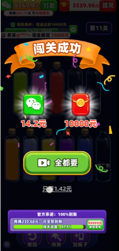 3、成功将所有的液体分开,并装满对应的瓶子即可过关。
